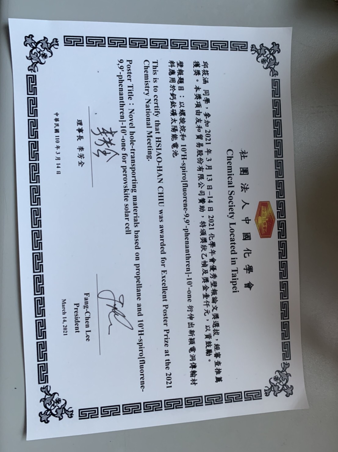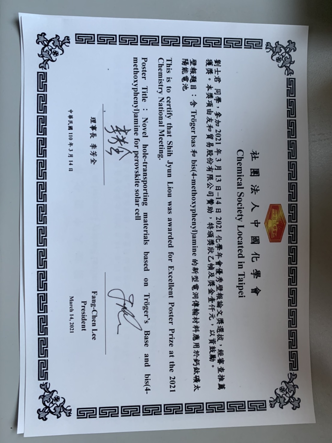 劉士君同學(張源杰老師實驗室)獲得2021化學年會優秀壁報論文獎